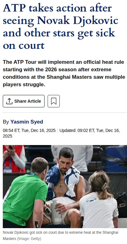tammy84+FollowDjoker & Sinner Force ATP Heat Rule ChangeAfter the Shanghai Masters saw King Novak and Sinner both struggle with brutal heat—Djoker even getting sick on court—the ATP finally listened. Rune and Berrettini led the charge, demanding a rule like the Slams. Now, starting 2026, the ATP will use the WBGT to trigger cooling breaks or even suspend matches when temps soar. This is a huge win for player safety and could change how we watch summer tennis! Thoughts on how this will impact the big rivalries? #Sports #Tennis #Djokovic00Share
