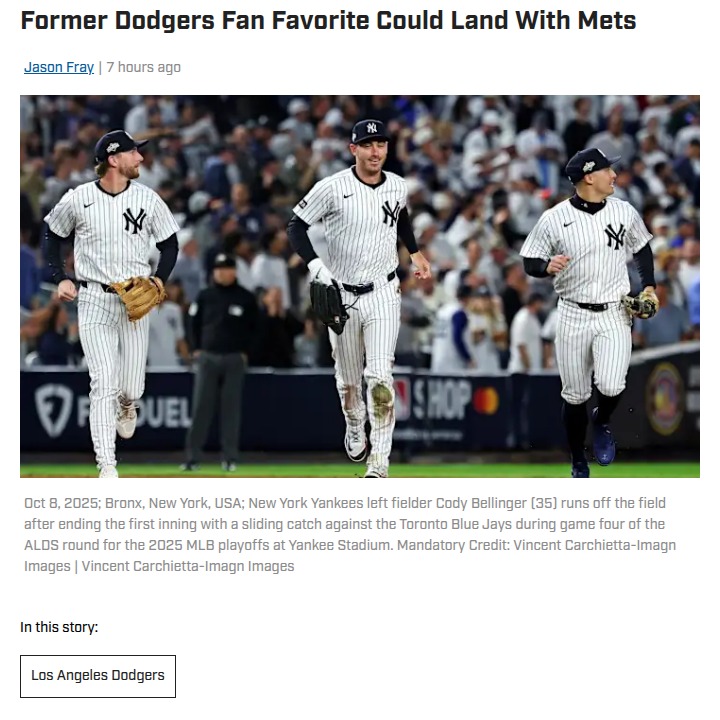Tammy Sellers+FollowBelli Watch: Could the MVP Land in Queens?Looks like the Cody Bellinger sweepstakes are heating up! While many Dodger fans are dreaming of a Belli reunion in LA, the Mets and Yankees are making serious moves for the former MVP. With the Mets needing to fill big holes after losing Alonso and Nimmo, Belli’s glove and versatility could be a game-changer in Queens. Do you think the Dodgers should go all-in, or is Belli destined for the Big Apple? #Sports #Baseball #Dodgers00Share