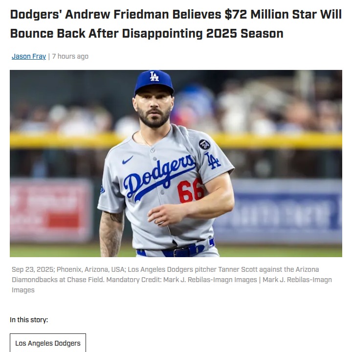 Kimberly Moore+FollowWhy Dodgers fans should bet on Tanner ScottTanner Scott’s 2025 season with the Dodgers was a rollercoaster—big contract, high hopes, but a tough year with injuries and blown saves. Now, the front office is doubling down on their faith in him. Andrew Friedman says Scott’s hunger to bounce back is real, and with Edwin Diaz joining the bullpen, Scott can slide into a setup role where he’s thrived before. The pressure’s off, the support is there, and the motivation is sky-high. Do you think Scott will deliver in 2026, or is this a risky bet? Let’s hear your take! #Sports #Baseball #Dodgers10Share