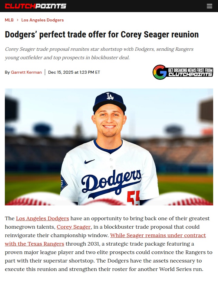 Catherine Reeves+FollowDodgers Eye Seager Reunion for October GloryDodger Nation, how would you feel about bringing back World Series MVP Corey Seager in a blockbuster deal? The front office is reportedly eyeing a trade that would send top prospects and Andy Pages to Texas for Seager, aiming to reunite him with Mookie and Freddie. This move could be the spark for another championship run and would settle the ongoing shortstop debate in LA. Is this the missing piece for another ring, or too steep a price for the future? #Sports #Baseball #Dodgers01Share