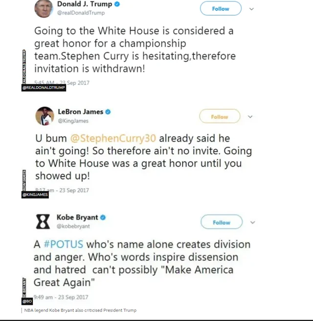 Patty Mills+FollowSept. 23, 2017: LeBron called Trump a “bum”One of the most famous NBA moments of the modern era happened on September 23, 2017. That morning, President Donald Trump tweeted that Stephen Curry’s White House invitation was “withdrawn” because Curry was “hesitating.” LeBron responded almost immediately, saying Curry had already decided he wasn’t going—then fired the shot heard around sports Twitter: “U bum… Going to White House was a great honor until you showed up!” Kobe Bryant also jumped in that same day with his own blunt critique, calling out a president whose name “creates division and anger.” Is this all-time NBA tweet? #NBA #LeBronJames #StephenCurry #Warriors #Sports #NBADiscussion #DonaldTrump 301Share