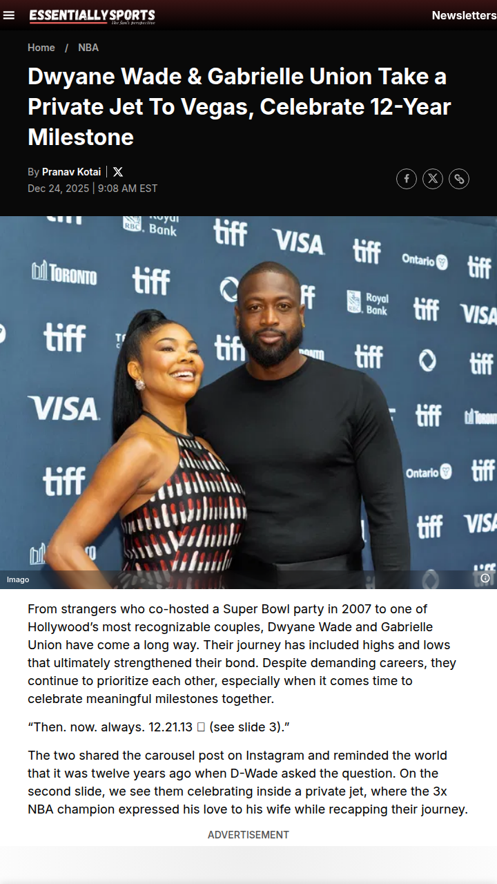 Nicole Obrien+FollowD-Wade & Gab Union’s Vegas Anniversary FlexFlashback to 2013: Flash celebrated big as Flash and Gab Union marked 12 years since D-Wade popped the question. The Heat legend and his superstar wife took a private jet to Vegas, toasted with a rare 2013 bottle, and even caught Jeezy’s anniversary tour—joined by OG teammate UD and Faith. Through all the jet-setting and NBA grind, the Wades prove family and milestones always come first. Anyone else think this power couple sets the gold standard for balancing fame and family? #Sports #Basketball #DwyaneWade00Share