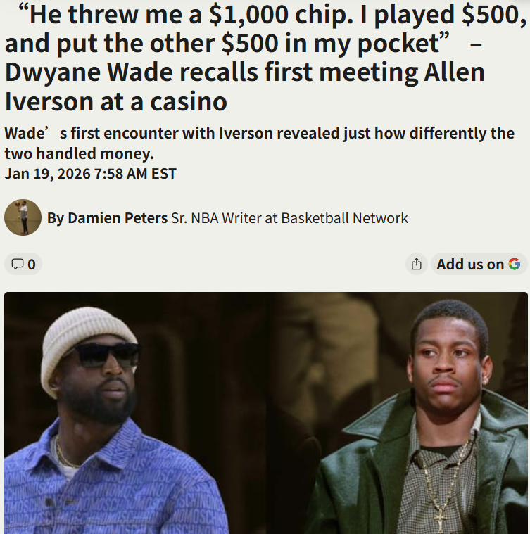 Amy Tanner+FollowWade’s Rookie Casino Test with The AnswerFlashback to when Flash met The Answer at a casino: D-Wade, fresh off the 2003 draft, gets tossed a $1,000 chip by Allen Iverson. Instead of going all-in, Wade plays $500 and pockets the rest—a move that showed his maturity and set him apart from other rookies. It’s wild how one night at the tables revealed the difference in money mindsets between A.I. and Wade. That restraint? It foreshadowed the legend Wade would become, both on and off the court. #Sports #Basketball #DwyaneWade00Share