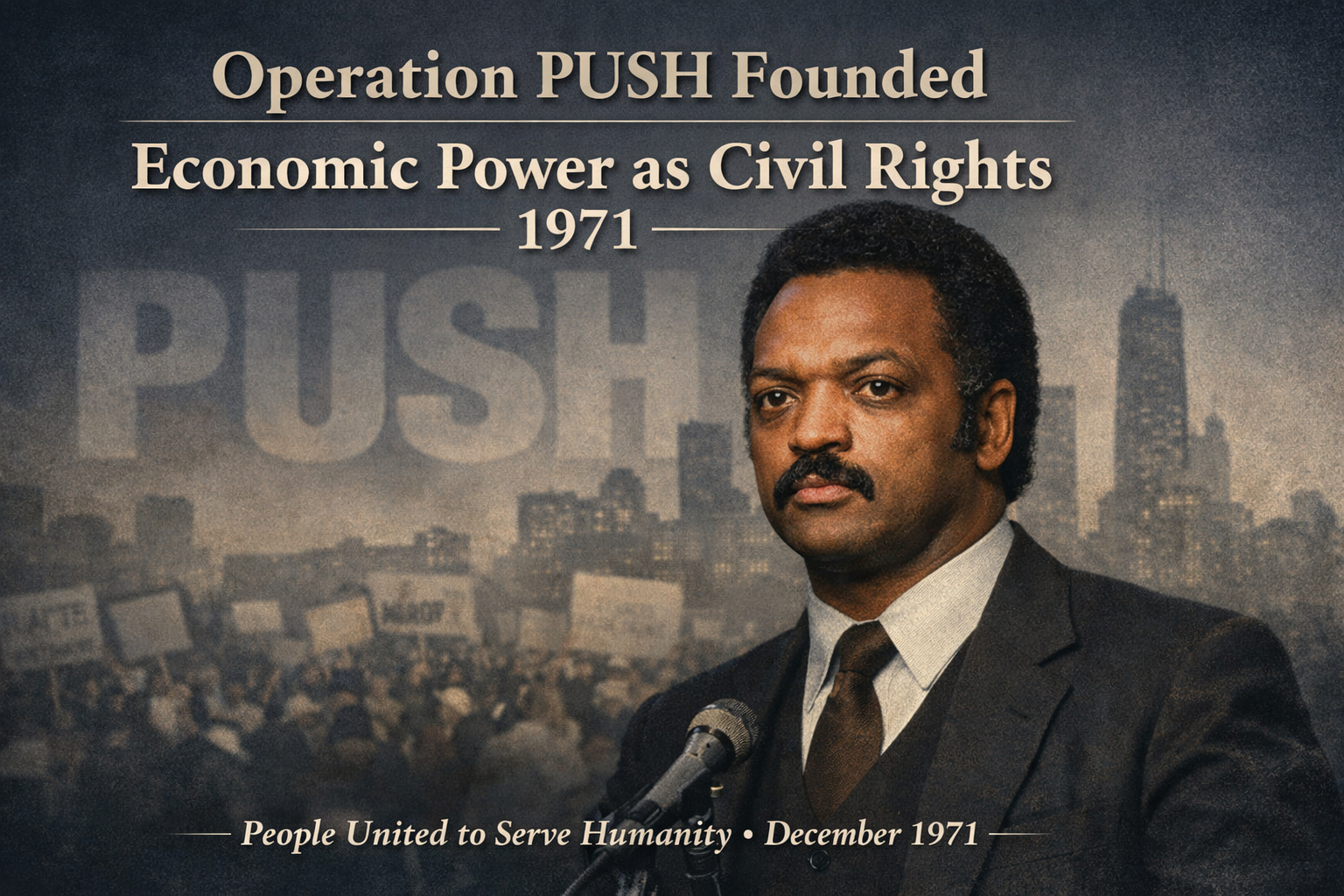 In December 1971, Rev. Jesse Jackson founded Operation PUSH (People United to Save Humanity), an organization that became a major force in promoting economic empowerment and corporate accountability in Black communities across the United States. The name later evolved to People United to Serve Humanity, reflecting a broader mission of long-term social and economic advancement. Operation PUSH was established after Jackson departed from Operation Breadbasket, the economic development arm of the Southern Christian Leadership Conference. While Breadbasket focused on negotiating fair hiring practices with major corporations, disagreements over leadership structure and direction led Jackson to pursue an independent path. This move marked a significant shift in post–civil rights era organizing, placing economic power and access at the center of the movement. Based in Chicago, Operation PUSH concentrated on expanding employment opportunities, increasing minority participation in corporate contracts, and strengthening Black-owned businesses. The organization used negotiations, boycotts, and public pressure campaigns to push companies toward more inclusive hiring and investment practices, producing measurable changes in several major industries. Operation PUSH also emphasized education as a pathway to economic progress. In later years, programs such as PUSH Excel supported student achievement and encouraged long-term success beyond high school. The founding of Operation PUSH reflected a broader transition in the civil rights movement during the early 1970s, as activists increasingly focused on economic equity and structural opportunity. In 1996, Operation PUSH merged with the Rainbow Coalition to form the Rainbow PUSH Coalition, which continues its work today. #OperationPUSH #JesseJackson #EconomicJustice #CivilRightsHistory #BlackEconomicPower #ChicagoHistory #SocialChange #HistoryMatters