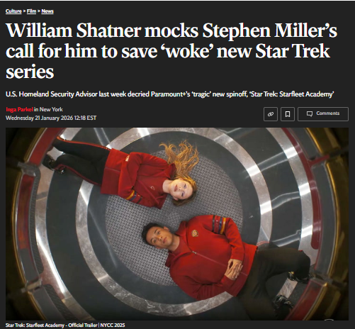 Francisco Thomas+FollowShatner Roasts Miller’s Star Trek ‘Woke’ Rant 🚀William Shatner just trolled Stephen Miller’s meltdown over the new Star Trek: Starfleet Academy. Miller begged Shatner to ‘save’ the show from being ‘woke,’ but Shatner fired back, joking about the ‘crisis’ of glasses in the 32nd century. Fans are split: is Shatner mocking the anti-woke crowd, or just having fun? Either way, Miller’s call for a ‘Shatner takeover’ totally backfired and fandom is loving the chaos. #Entertainment #Movies #WilliamShatner271Share