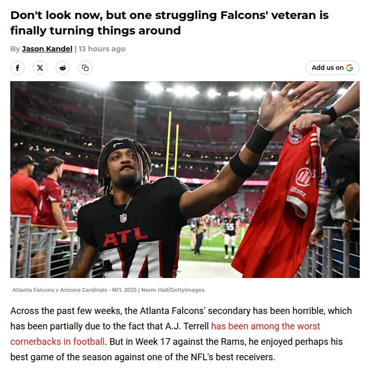 Chad Williams+FollowA.J. Terrell’s lockdown lifts Falcons over RamsA.J. Terrell just delivered the kind of performance Falcons fans have been waiting for all season. After weeks of struggles, Terrell completely shut down Puka Nacua—one of the NFL’s hottest receivers—holding him to just two catches for 17 yards in their matchups. Terrell forced a season-high seven tight window throws and avoided penalties, a huge turnaround from earlier games. This defensive masterclass was a major reason Atlanta pulled off the win against the Rams. With Terrell stepping up, could this be the spark the Falcons’ secondary needs for a late-season surge? What do you think changed for him? #Sports #Football #Falcons00Share