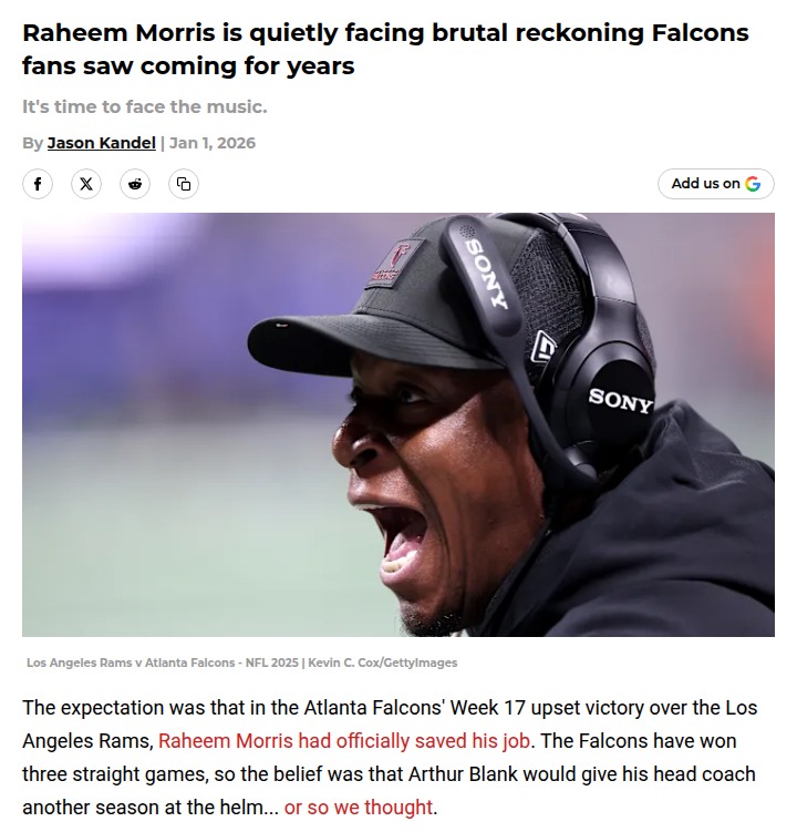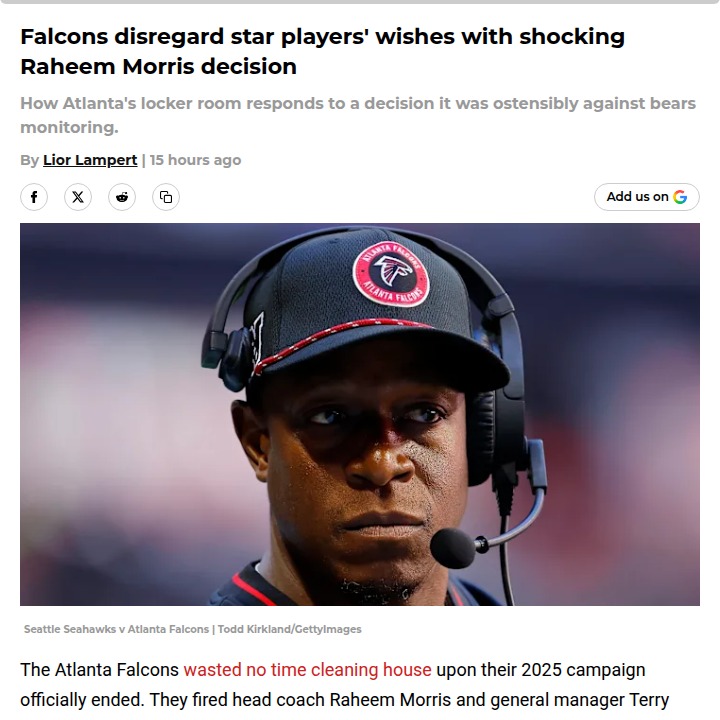 Chad Williams+FollowFalcons shake up leadership after playoff missBig changes are coming to Atlanta: the Falcons just let go of both head coach Raheem Morris and GM Terry Fontenot after another season without a playoff spot. Even with a late surge and a win over the Saints, owner Arthur Blank decided it was time for a fresh start. Players like Drake London and Bijan Robinson had backed Morris, but the front office wants new energy. Now, the hunt is on for new leadership. What do you think—was this the right move, or should they have stuck with Morris and Fontenot a little longer? #Sports #Football #Falcons00Share
