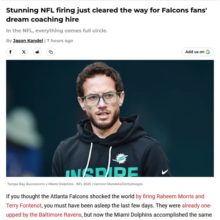 glen25+FollowFalcons fans brace for coaching shakeupDespite a late-season surge, Raheem Morris’ future as the Falcons’ head coach is looking shakier than ever. Atlanta’s recent wins haven’t erased a season full of blown leads and missed opportunities, and now, insiders say big changes could be coming. For a team that should be leading the NFC South, falling short again is tough to swallow. Many fans saw this reckoning coming, and it feels like the front office is finally catching up. What do you think—should the Falcons stick with Morris, or is it time for a fresh start on the sidelines? #Sports #Football #Falcons01Share