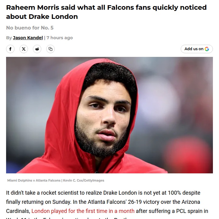 Chad Williams+FollowDrake London’s tough return for FalconsWatching Drake London back on the field for the Falcons, it was clear he’s still not at full speed after that PCL sprain. Even though he only managed three catches for 27 yards, he still led Atlanta’s receivers—a sign of just how thin the WR group is right now. Raheem Morris admitted London wasn’t himself, but seeing him gut it out after a month off says a lot about his value to the team. Should the Falcons have played it safer with London, or does his presence outweigh the risk? #Sports #Football #Falcons00Share