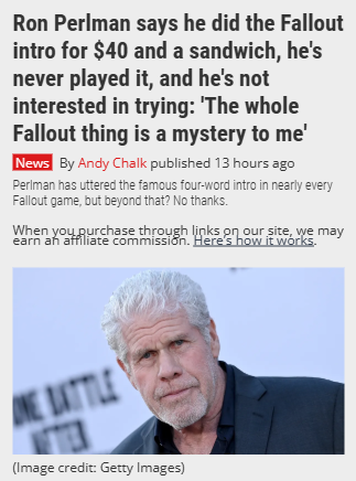 Savannah Smith+FollowRon Perlman’s Fallout Payday: $40 & a Sandwich 🥪Ron Perlman’s Fallout intro is legendary, but did you know he’s never played the games—and doesn’t want to? On the Joe Vulpis Podcast, Perlman revealed he only did the iconic “War. War never changes” line for $40 and a sandwich, and the whole Fallout phenomenon is still a total mystery to him. Fans are debating: is this the most casual approach to a cult classic ever? #Entertainment #RonPerlman #Fallout00Share