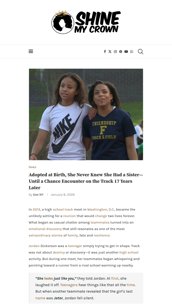 jharvey+FollowSisters reunited by fate at a DC track meetImagine growing up just miles apart, never knowing your sibling was right there the whole time. That’s exactly what happened to Jordan Dickerson and Robin Jeter in Washington, D.C. – adopted at birth, Jordan only learned she had a sister after a chance encounter at a high school track meet. Their story isn’t just about family, but about how life’s biggest surprises can come from the most ordinary moments. How would you react if you discovered a long-lost sibling at a school event? Have you ever had a life-changing encounter in an unexpected place? #Sports #FamilyReunion #DCStories00Share