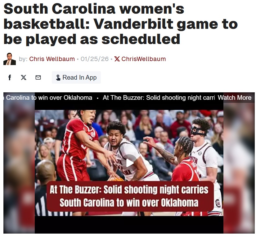 AmberAbyss+FollowSouth Carolina vs Vanderbilt game still on!Despite wild winter weather sweeping the Southeast, the big South Carolina vs Vanderbilt women’s basketball game is sticking to its Sunday schedule at Colonial Life Arena. If you’re planning to go, bundle up and be extra careful—parking lots and entrances could be slick, and some arena services might be limited if staff can’t make it in. Doors open at 2 p.m., but check GamecocksOnline.com or social media for any last-minute updates. Who’s braving the cold to cheer on their team? Let’s talk game-day plans and weather worries below! #Sports #Gamecocks #Vanderbilt00Share