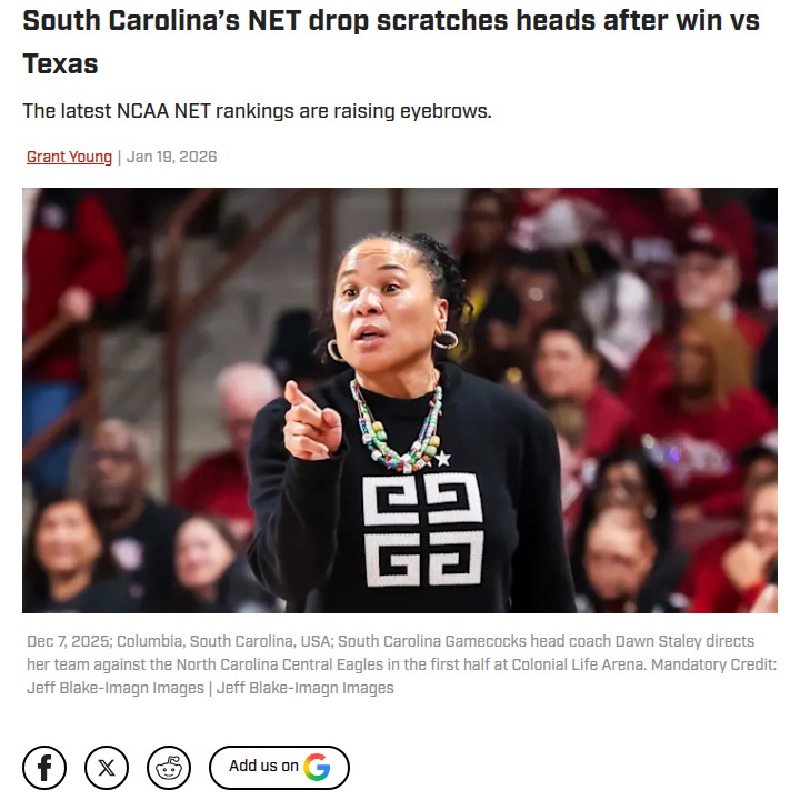 Patrick Gonzales+FollowSouth Carolina’s NET Drop Baffles FansGamecock Nation, what’s up with the NET rankings? After the Lady Gamecocks took down Texas, somehow the Longhorns leapfrogged us in the NCAA’s all-important NET—even after back-to-back losses! The NET’s math is wild, factoring in more than just wins, but this has fans scratching their heads. Could this shake up March Madness seeding? Let’s hear your takes on this SEC vs. Big 12 drama! #Sports #Basketball #Gamecocks10Share