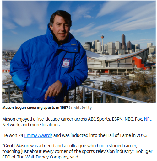 Jacob Morris+FollowFox Sports Legend Geoffrey Mason RememberedSad news for the sports world—Geoffrey Mason, the Hall of Fame broadcaster who shaped Fox Sports and ESPN, has passed away at 85. Mason’s five-decade career saw him rack up 24 Emmys and produce iconic moments, from Super Bowls to the Olympics. His impact on sports TV is unmatched. Anyone else remember his signature calls or favorite broadcasts? #Sports #GeoffreyMason #FoxSports00Share