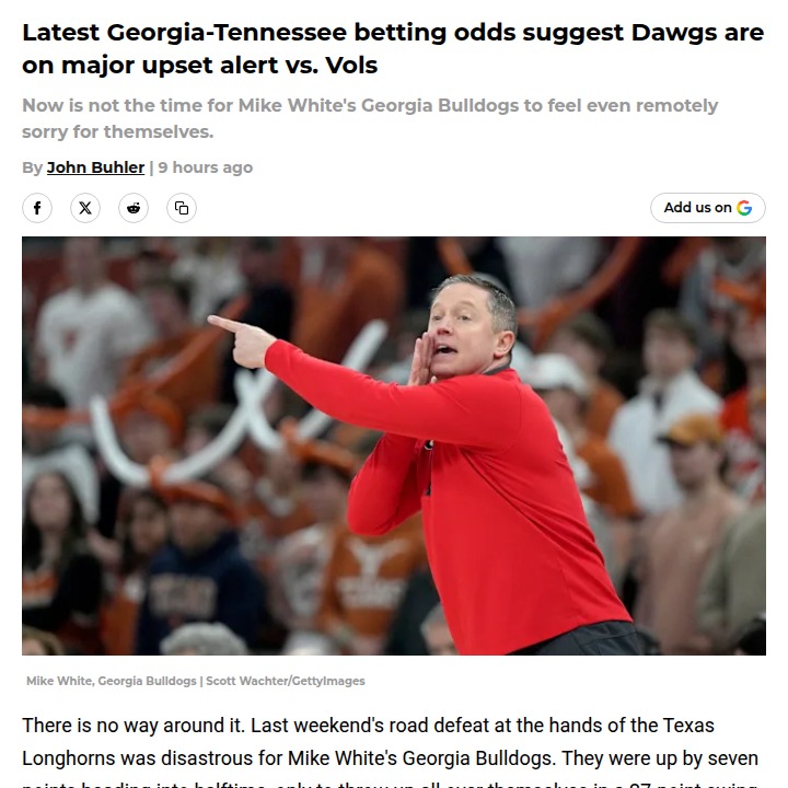 Aaron Gentry+FollowDawgs face high-stakes showdown vs. VolsGeorgia fans, this week’s matchup against Tennessee is shaping up to be a real nail-biter. Oddsmakers are barely giving the Dawgs the edge at home, and after last weekend’s collapse in Texas, the pressure is on. With seven Quad 1 games left, Georgia’s tournament hopes could hinge on how they handle this stretch—especially these next two home games. Can Coach White’s squad bounce back and prove the doubters wrong, or will Tennessee spoil the party in Athens? What do you think will make the difference in this SEC clash? #Sports #GeorgiaBulldogs #TennesseeVols00Share