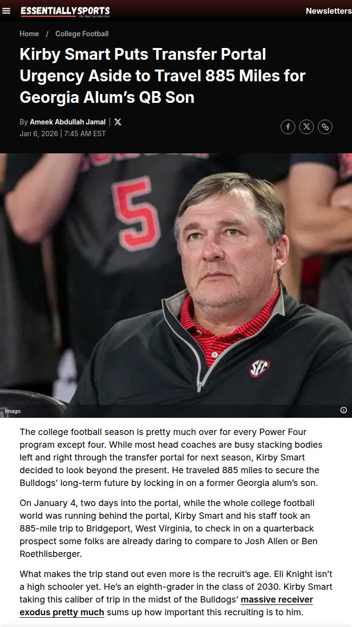 Jeffrey Armstrong+FollowKirby Smart’s Bold 885-Mile QB MoveWhile most coaches are glued to the transfer portal, Kirby Smart just made headlines by traveling 885 miles to scout Eli Knight—an eighth-grade QB prospect and son of a Georgia alum. With the Dawgs losing key receivers, Smart’s focus on the future is next-level. Some are already comparing Knight to Josh Allen. Is this the next big rivalry brewing before he’s even in high school? #Sports #Football #GoDawgs50Share