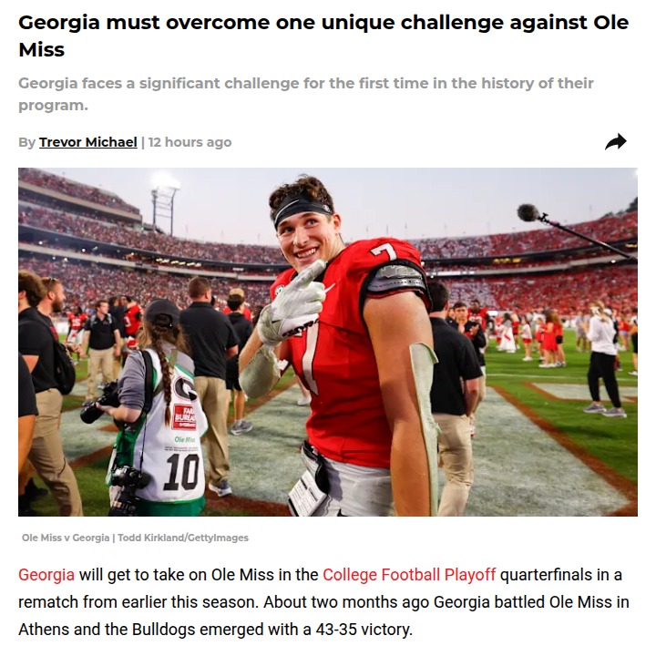 John Camacho+FollowBulldogs Face Rematch Test vs Ole MissDawg Nation, here we go again! Georgia’s set for a high-stakes College Football Playoff rematch against the Rebels. Last time, the Dawgs edged out Ole Miss in Athens, but beating a top team twice in one season is no easy feat—even for Kirby Smart’s crew. This is the first time under Smart that UGA’s had back-to-back rematches, and you know Lane Kiffin’s squad is fired up for revenge. Can the Dawgs stay perfect in rematch games? Let’s hear your takes! #Sports #Football #GoDawgs00Share