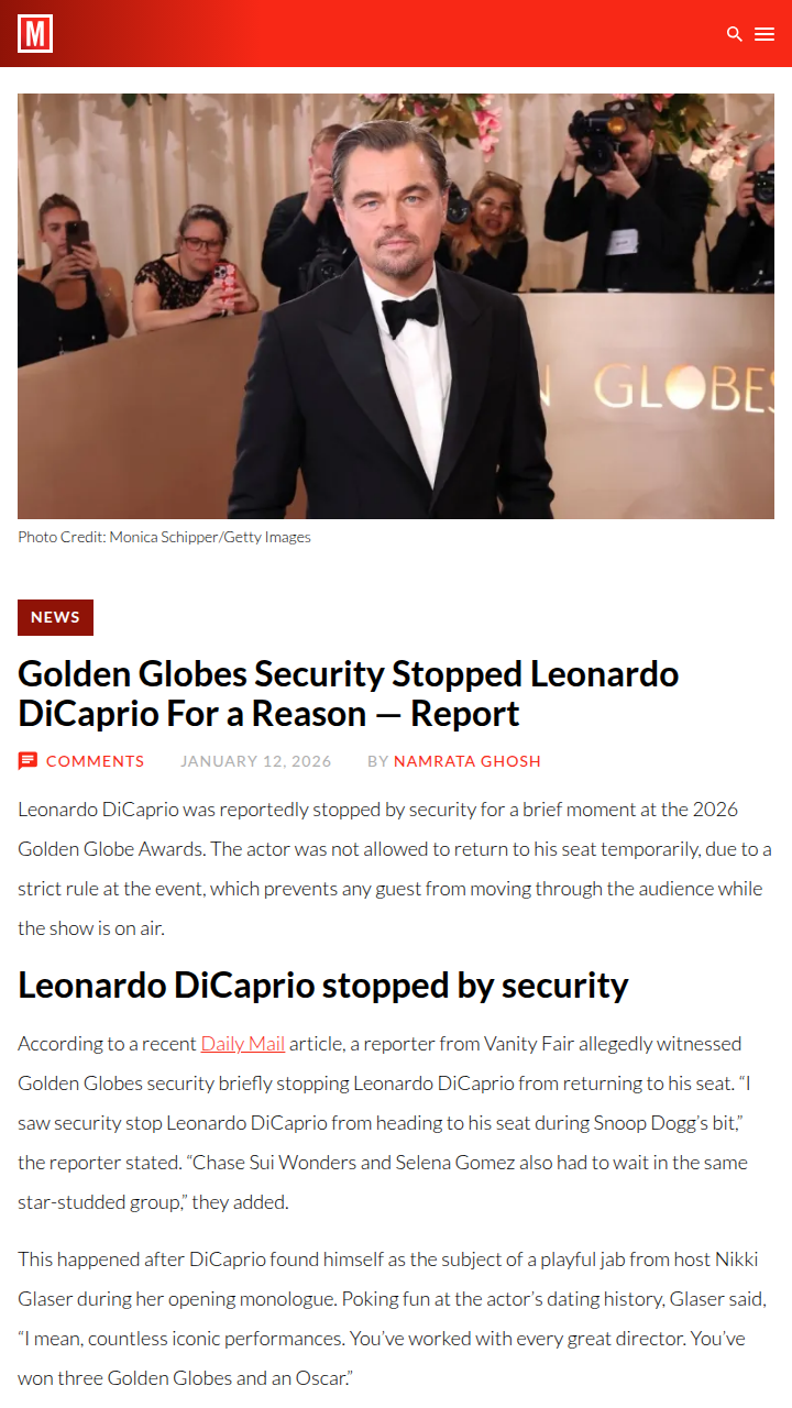 Leah Gonzales+FollowLeo DiCaprio Stopped by Security?! 🚨Leonardo DiCaprio got stopped by Golden Globes security and had to wait in the aisle with other celebs like Selena Gomez and Chase Sui Wonders! All this right after Nikki Glaser roasted him about his dating history on live TV. Fans are debating if the strict rules went too far or if Leo’s reaction to the joke was the real highlight. Did the Golden Globes get too strict this year or was it all just good TV? #Entertainment #Celebrity #GoldenGlobes01Share