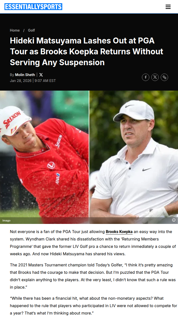 Tammy Davenport+FollowPGA Tour Bends Rules for Brooks?So, King Koepka is back on the PGA Tour without serving the usual suspension for LIV Golf defectors, and Hideki is not having it. Matsuyama and Wyndham Clark both called out the Tour for letting Brooks skip the wait and just buy his way in, while others like Chacarra have to grind for their spot. The field at Torrey Pines even expanded just to fit Brooks in. Fair or foul? Let’s hear your takes! #Sports #Golf #PGATour00Share