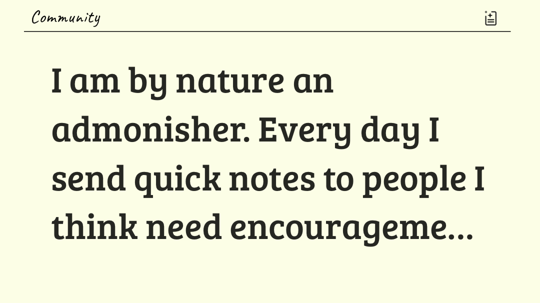Jeanne P+FollowI am by nature an admonisher. Every day I send quick notes to people I think need encouragement. In doing so I know I am widely, but faithfully doing God’s work. We all need words of encouragement. #Hebrews_10_24 61Share