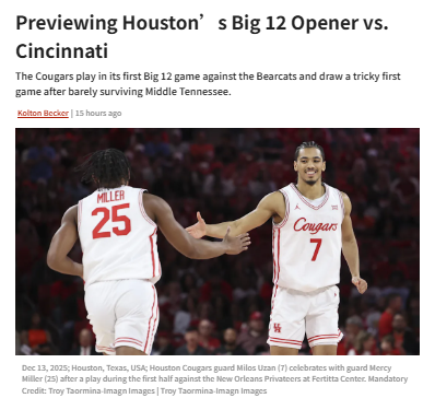 EchoingEagle+FollowHouston’s Big 12 opener: Rivalry renewedHouston’s basketball team kicks off Big 12 play against Cincinnati, and this matchup is more than just another game—it’s a battle between two programs tied in their all-time series. Houston comes in hot with a 12-1 record, while Cincinnati is looking to shake things up. With both teams’ coaches bringing years of experience and a history of close contests, fans can expect a physical, high-energy showdown. Will Houston’s home-court advantage and recent dominance tip the scales, or does Cincinnati have a surprise in store? Who are you rooting for, and what’s your bold prediction? #Sports #HoustonBasketball #Big1200Share