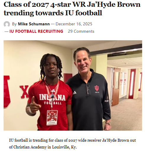 Amy Williams+FollowIU football closing in on 4-star WR Ja’Hyde BrownJa’Hyde Brown, one of the nation’s top 50 receivers for the class of 2027, looks to be leaning toward IU football for his college career. Brown, who just led Christian Academy in Louisville to a perfect season with 1,556 yards and 24 touchdowns, is a game-changer who could electrify the Hoosiers’ offense from the slot and on special teams. With powerhouse programs like Alabama and Kentucky also in the mix, landing Brown would be a huge win for IU. What do you think—could Brown be the spark IU needs for a breakout season? #Sports #Football #IUFootball00Share