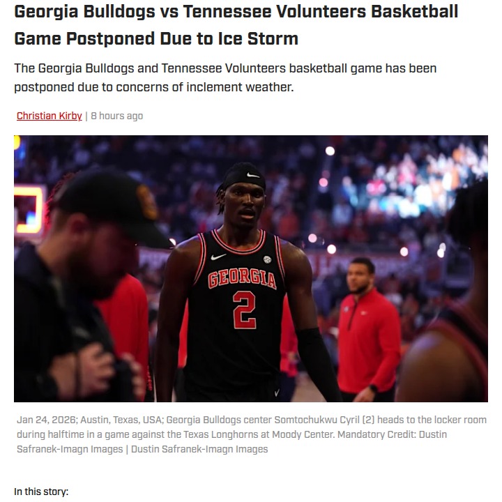 Susan Reeves+FollowIce storm shakes up Georgia vs Tennessee game plansAn ice storm sweeping through the Southeast has thrown a wrench into the much-anticipated Georgia Bulldogs vs Tennessee Volunteers basketball showdown in Athens. With safety as the top priority, both universities postponed the game to Wednesday night and canceled classes, urging everyone to stay off the roads. This matchup means more than just a rescheduled tip-off—Georgia is hungry for redemption after a tough loss and a five-game skid against Tennessee, while the Vols are riding high from a big win. How do you think this weather delay will impact the teams’ momentum and fan turnout? #Sports #Basketball #IceStorm00Share