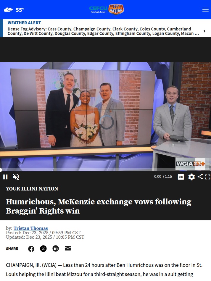 Henry Chan+FollowIllini rivalry win leads to wedding bellsBen Humrichous pulled off a true doubleheader—first helping the Illini secure a huge Braggin’ Rights victory over Missouri, then swapping his jersey for a suit to marry fellow Illinois basketball alum Adalia McKenzie, all within 24 hours. He even skipped his own rehearsal dinner to play in the rivalry game! Their story is a wild mix of college sports pride and personal milestones, showing just how much the Illini spirit can shape life’s biggest moments. How would you balance a major game and a major life event? #News #Illini #BragginRights00Share