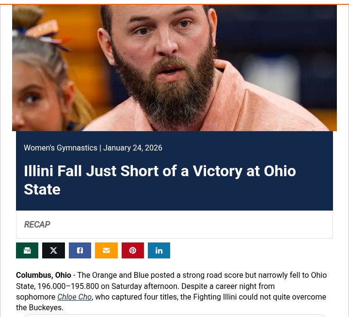Jacob Morris+FollowIllini nearly topple Ohio State in ColumbusA razor-thin finish in Columbus saw the Illini women's gymnastics team fall just short against Ohio State, losing by only 0.2 points. Chloe Cho’s career night, including four event titles and a beam score that matched her personal best, kept Illinois in the hunt. Freshman Ava Banks also made waves with a new high on floor. Despite season-best team scores in three events, the Illini couldn’t quite close the gap. With this kind of momentum, what do you think will push Illinois over the top when they return home to face Maryland next week? #Sports #Illini #OhioState00Share