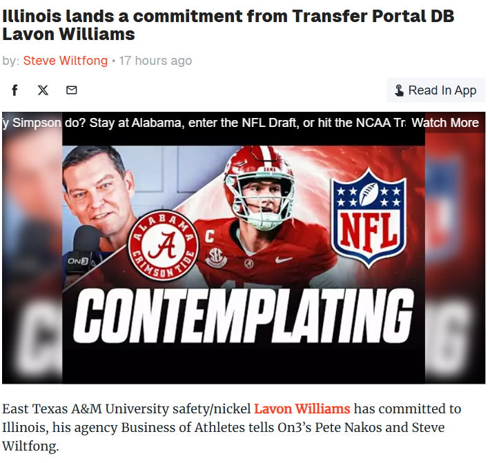 Jeffrey Armstrong+FollowIllinois snags top DB Lavon Williams from portalIllinois just scored a major boost to its defense with the addition of Lavon Williams from East Texas A&M. Williams brings serious experience—he’s played 25 college games and started 20, racking up 139 tackles, 14 pass breakups, and 4.5 sacks. With only one year of eligibility left, he’s expected to make an immediate impact in the Illini secondary. This move could be a game-changer for Illinois’ defense next season. What do you think—will Williams’ arrival help Illinois climb the Big Ten ranks? Let’s hear your thoughts on this transfer portal win! #Sports #Football #IllinoisFootball00Share