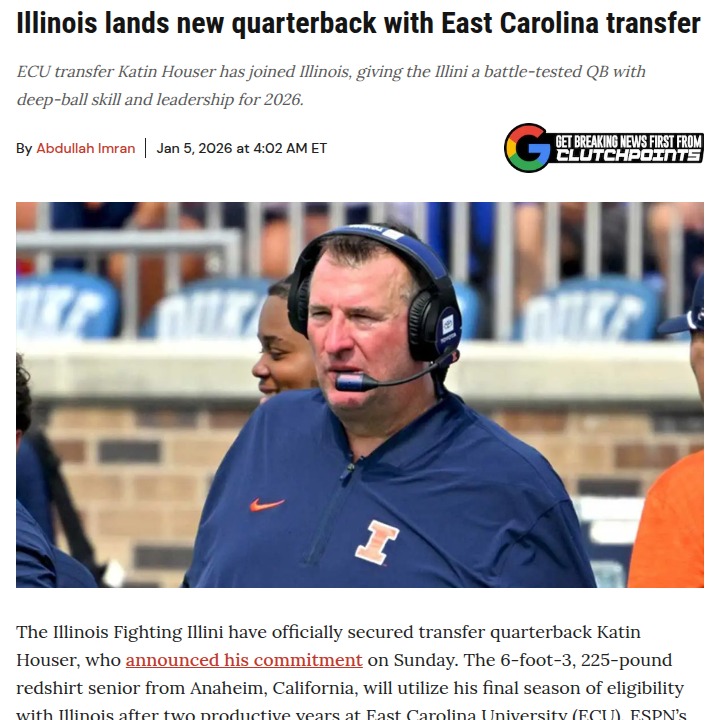 Jeffrey Armstrong+FollowIllinois football’s QB hunt heats upLosing Luke Altmyer means Illinois is facing a massive shift—he wasn’t just a playmaker, he was the engine behind the Illini’s recent success. Now, all eyes are on Katin Houser, the electric ECU quarterback who’s fresh off a breakout season. Illinois wants him, but so does Arkansas, and the SEC’s pull is real. The transfer portal drama is in full swing, and Bret Bielema’s got a chance to prove Illinois can win big recruiting battles. If Houser lands in Champaign, it could be a game-changer. What do you think—can Illinois out-recruit the SEC this time? #Sports #Football #IllinoisFootball00Share