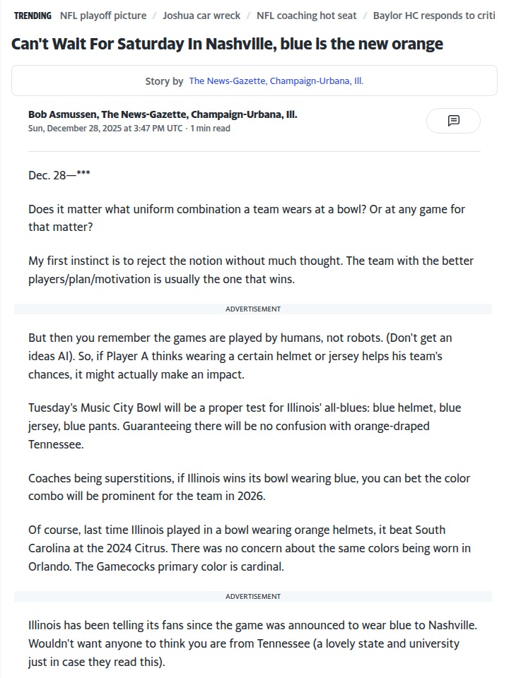Aaron Taylor+FollowNashville bowl game: Illinois goes all blueIllinois fans heading to Nashville, get ready for a sea of blue this Saturday! The Illini are ditching their usual orange for a bold all-blue look—helmet, jersey, and pants—for the Music City Bowl against Tennessee. It’s not just about style; some believe the right uniform can actually boost a team’s confidence and performance. With Tennessee decked out in orange, there’s zero chance of a color clash. If Illinois pulls off a win in blue, expect this combo to become a new tradition. What do you think—can a uniform really make a difference on game day? #Sports #Football #IllinoisFootball00Share