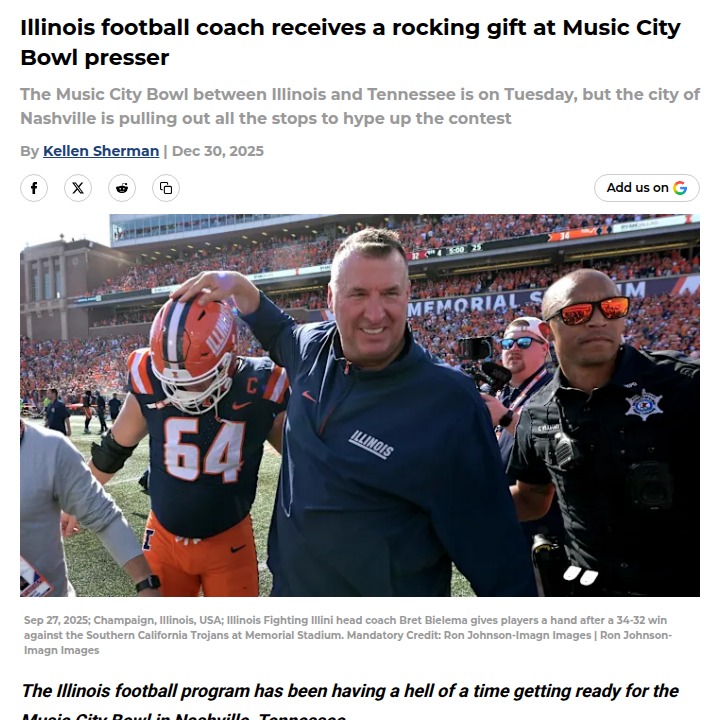 Aaron Taylor+FollowIllinois coach gets a Nashville surpriseIllinois football’s trip to the Music City Bowl just got even more memorable—Coach Bret Bielema was gifted a custom guitar at the bowl press conference, a nod to Nashville’s music scene and a fun twist on the usual key-to-the-city tradition. The Illini have been soaking up the Nashville experience, from hot wing contests to special events, but now it’s game time. With Tennessee’s high-powered offense waiting, Illinois is the underdog, but a win would mean back-to-back bowl victories for the first time in over a decade. Can the Illini pull off some history in Nashville? #Sports #Football #IllinoisFootball00Share