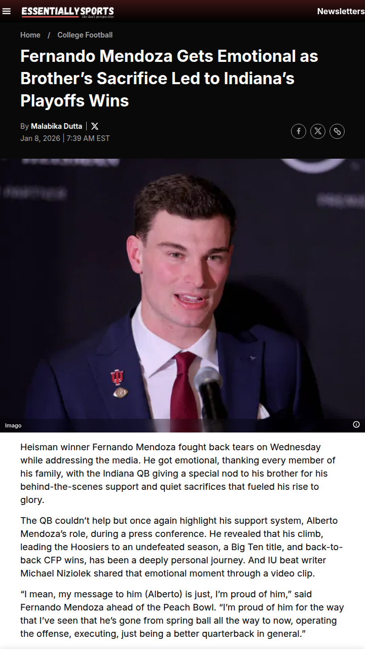 John Camacho+FollowBrotherly bond powers Indiana’s playoff runFernando Mendoza’s journey to the top with Indiana has been as much about family as football. The Heisman-winning QB got choked up talking about his brother Alberto, who’s been his biggest supporter and made real sacrifices behind the scenes. Alberto’s not just a backup—he’s made his own mark, stepping up when needed and pushing Fernando to be better. With both brothers on the Hoosiers, their story is about loyalty, grit, and the power of having someone in your corner. As Indiana heads into the Peach Bowl, this sibling duo is giving fans plenty to cheer—and talk—about. What’s your take on their impact? #Sports #Football #IndianaHoosiers10Share