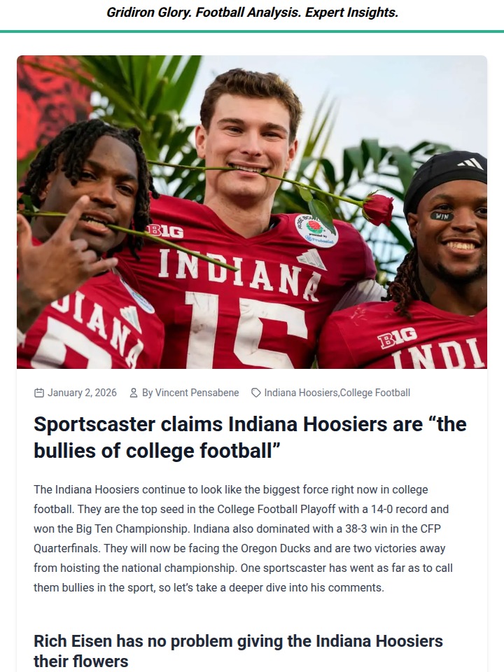 glen25+FollowIndiana Hoosiers: College football’s new powerhouseIndiana Hoosiers are steamrolling the competition this season—14-0, Big Ten champs, and now just two wins from a national title. Sportscaster Rich Eisen called them “the bullies of college football,” and it’s hard to argue: they’re putting up over 41 points a game and barely letting anyone score. Even when their Heisman-winning QB Fernando Mendoza isn’t on fire, the team just finds ways to dominate. With another showdown against Oregon coming up, do you think anyone can actually stop Indiana’s run? Let’s hear your thoughts on whether this is the start of a new dynasty! #Sports #Football #IndianaHoosiers00Share