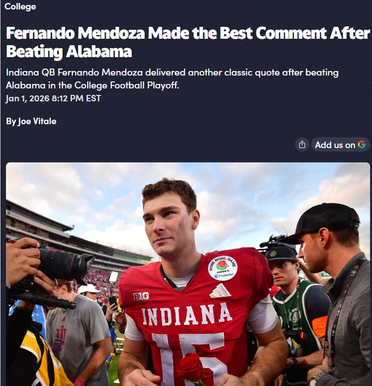 Jay Williams+FollowMendoza’s Humble Heisman After Bama BlowoutHoosier Nation, did you see Fernando Mendoza’s postgame after Indiana’s 38-3 thrashing of Bama? The Heisman winner could’ve flexed, but instead, he credited his entire squad: “I’m just 1 of 22.” Total class act. Indiana’s D held the Tide to just 23 rushing yards! Now it’s on to a Peach Bowl rematch with the Ducks. Can Mendoza and the Hoosiers keep this dream run alive? #Sports #Football #IndianaHoosiers10Share