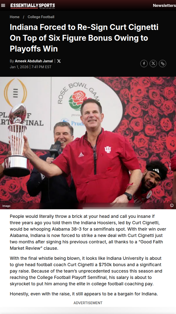 Christopher Hughes+FollowIndiana Hoosiers’ wild playoff run triggers massive Cignetti paydayIndiana football just pulled off what no one saw coming—crushing Alabama for a spot in the College Football Playoff semifinals and staying undefeated. That win didn’t just shock fans; it triggered a unique contract clause for head coach Curt Cignetti. Now, Indiana has to renegotiate his salary to put him among the top three highest-paid coaches in the country, or risk losing him for nothing. With Cignetti already earning big bonuses and about to join the $12M+ club, is this the best money Indiana’s ever spent? What do you think—worth every penny, or is college football pay getting out of hand? #Sports #Football #IndianaHoosiers00Share