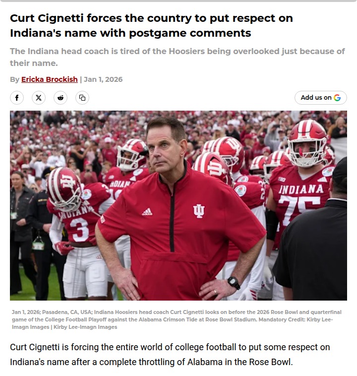 Jeffrey Armstrong+FollowIndiana stuns Alabama in historic Rose Bowl winIndiana just flipped the script on college football, crushing Alabama 38-3 in the Rose Bowl and making history as the first team with a first-round bye to win in the new 12-team playoff format. Coach Curt Cignetti isn’t shy about it—he’s making sure the world knows Indiana football is no longer a punchline. His postgame comments called out doubters and showed this team is built for big moments. With a rematch against Oregon up next, do you think Indiana’s underdog run can keep rolling? Let’s hear your thoughts on this Hoosier transformation! #Sports #Football #IndianaHoosiers00Share