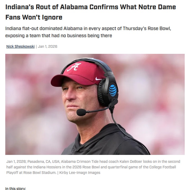 Christopher Hughes+FollowIndiana stuns Alabama, Notre Dame fans sound offWatching Indiana absolutely dismantle Alabama 38-3 in the Rose Bowl was a jaw-dropper—especially for Notre Dame fans who felt snubbed by the playoff committee. Indiana looked every bit the nation’s top team, while Alabama struggled in every phase, raising big questions about how playoff spots are decided. It’s hard not to wonder how different things could’ve been if Notre Dame had gotten their shot. After this blowout, do you think the committee needs to rethink how teams are selected? Is it time for a shakeup in the playoff process? #Sports #Football #IndianaHoosiers00Share