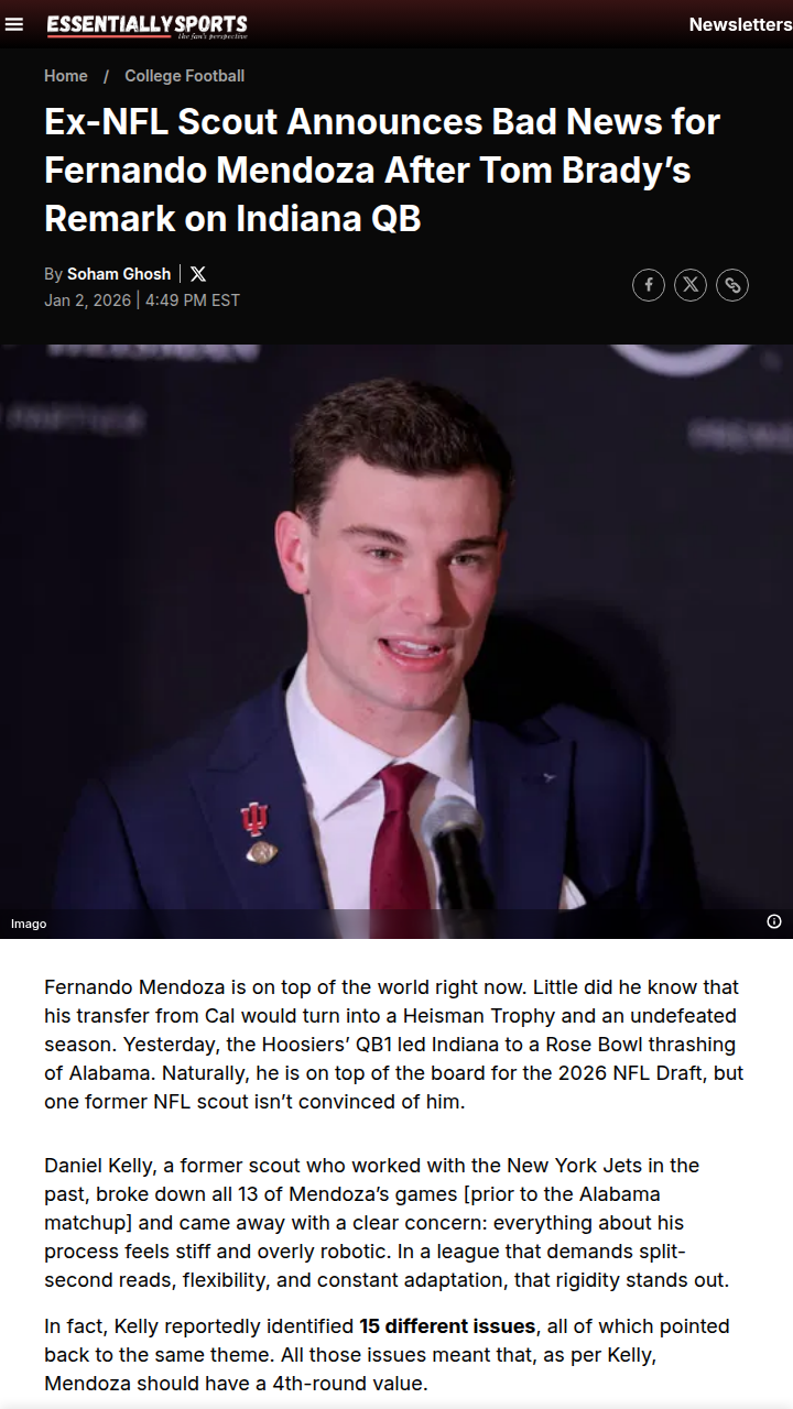 Christopher Hughes+FollowScout Throws Shade at Fernando MendozaHoosier Nation, what do you make of this? After QB1 Fernando Mendoza just led Indiana to a Rose Bowl beatdown of Bama and is being hyped as the next big thing (even getting a nod from the GOAT, Tom Brady), ex-NFL scout Daniel Kelly is still not sold. He says Mendoza’s game is too stiff and robotic for the pros, even giving him a 4th-round grade. But after that clutch performance against blitz-happy Alabama, is the criticism fair or just draft season noise? #Sports #Football #IndianaHoosiers32Share