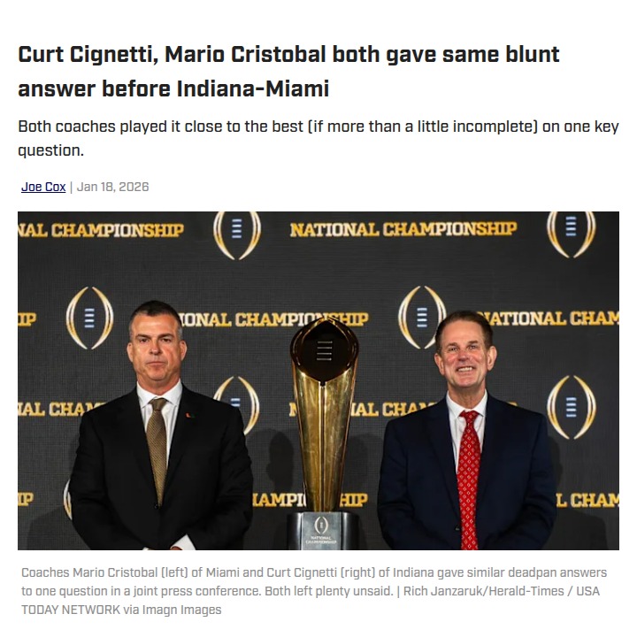 Amy Williams+FollowIndiana vs Miami: Coaches Keep It CrypticDid anyone else catch the identical, no-nonsense answers from Coach Cignetti and Coach Cristobal before the Indiana-Miami showdown? Both just said winning would mean they’re national champs—nothing more. But let’s be real: for the Hoosiers, this would be a total Cinderella story, and for the Canes, it’s a shot at reclaiming old glory. Feels like both coaches are downplaying what could be a historic moment for their programs! #Sports #Football #IndianaHoosiers00Share