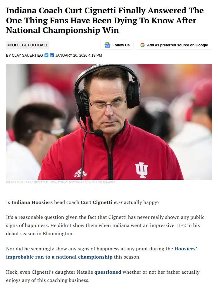 glen25+FollowCurt Cignetti finally cracks a smile after Indiana’s historic winSeeing Curt Cignetti beam after Indiana’s first-ever national football championship was almost as shocking as the Hoosiers’ perfect season. Known for his stone-faced focus on the sidelines, Cignetti’s rare grin—shared by linebacker Aiden Fisher—felt like the ultimate reward for fans who’ve watched him transform Indiana from a 3-9 team to the nation’s best in just two years. The coach says he keeps his cool to set the tone for his players, but this time, even he couldn’t hide his joy. What do you think: does a coach’s sideline demeanor really impact a team’s performance? #Sports #Football #IndianaHoosiers10Share
