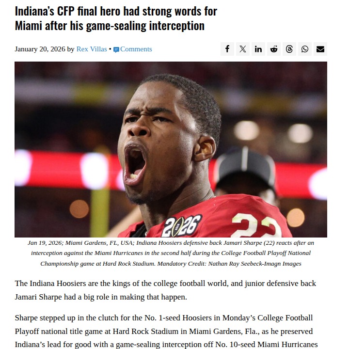 Christopher Hughes+FollowSharpe’s Revenge: Indiana vs Miami ShowdownHoosier Nation, how about that finish? Jamari Sharpe, the Miami native Miami didn’t want, sealed Indiana’s first CFP title with a clutch pick against the Hurricanes. With just 52 seconds left, Sharpe read Beck like a book and ended Miami’s comeback hopes. His postgame words? Pure fire: “I guess I showed them tonight why they should have recruited me.” This rivalry just got a new chapter! #Sports #Football #IndianaHoosiers00Share
