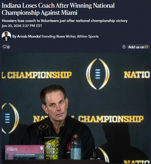 Jay Williams+FollowIndiana vs Miami: Hoosiers Win, But Lose Key CoachHoosier Nation, what a wild ride! After Fernando “The General” Mendoza led Indiana past Miami for our first national title, the celebration was cut short—Coach Owings, the mastermind behind our muscle, is heading to Tennessee. Curt Cignetti’s got a big hole to fill, but with Mendoza’s grit and the Hoosiers’ momentum, I’m confident we’ll stay on top. How do you all feel about this rivalry win and the staff shakeup? #Sports #Football #IndianaHoosiers00Share
