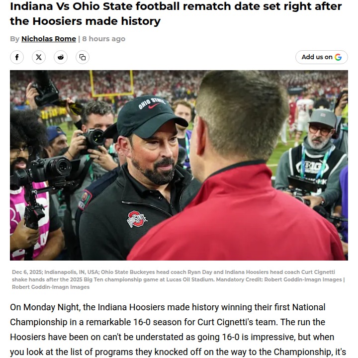 Aaron Taylor+FollowIndiana vs Ohio State: The rematch everyone’s waiting forIndiana just pulled off a perfect 16-0 season and clinched their first-ever National Championship, knocking off giants like Oregon, Alabama, and Miami along the way. But for Hoosiers fans, nothing topped their win over Ohio State in the Big Ten title game. Now, circle October 17, 2026—Indiana and Ohio State are set for a regular season rematch. With both teams reloading and playoff hopes on the line, this game could shape the entire college football landscape. Who do you think has the edge this time around? #Sports #Football #IndianaHoosiers10Share