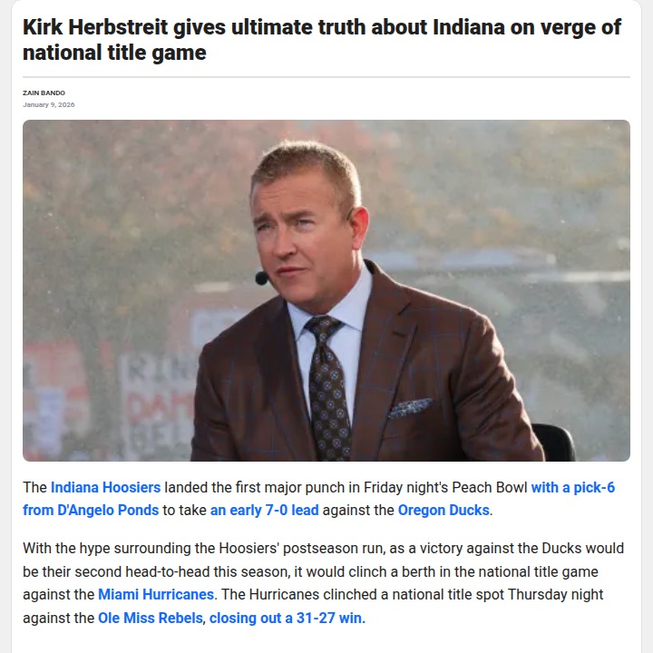 Chad Williams+FollowHerbstreit: Hoosiers Hold the Edge vs DucksHoosier Nation, how about that D’Angelo Ponds pick-6 to kick off the Peach Bowl? Indiana’s defense came out swinging, and even ESPN’s Kirk Herbstreit is giving the Hoosiers the edge to make the national title game. With Coach Cignetti’s energy and a second win over the Ducks, Indiana could be on a collision course with the Hurricanes. Can Mendoza and the crew keep this historic run alive? #Sports #Football #IndianaHoosiers00Share