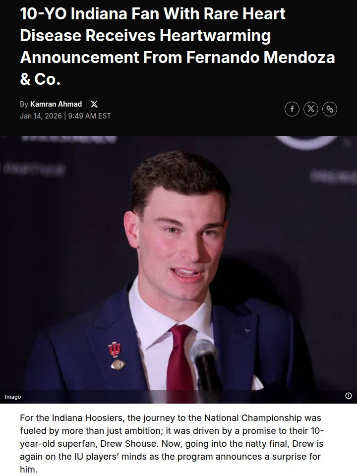 phughes+FollowIndiana’s 10-year-old hero inspires Hoosiers’ title runIndiana’s road to the National Championship isn’t just about football—it’s about keeping a promise to 10-year-old superfan Drew Shouse. Born with a rare heart condition and already a two-time open-heart surgery survivor, Drew’s courage has become the team’s rallying force. The Hoosiers just surprised Drew with a trip to Miami for the title game, making him part of their journey. Players like Fernando Mendoza and Isaiah Jones call Drew the heart and soul of the team. It’s amazing to see how one kid’s fight can unite a whole program. How do stories like Drew’s change the way you see sports? #Sports #Football #IndianaHoosiers00Share