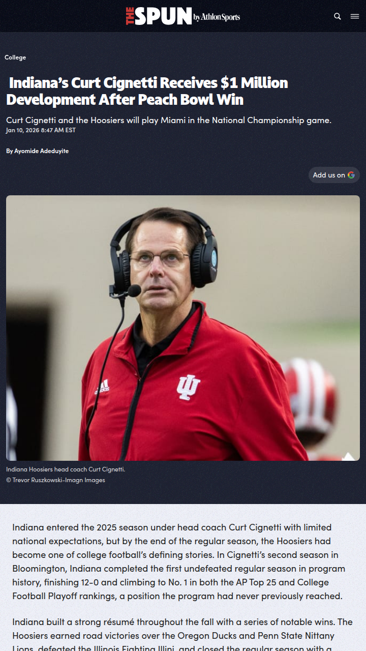 Jay Williams+FollowCignetti, Hoosiers Make History vs OregonHoosier Nation, how about Curt Cignetti and the Cardiac Crimson? Indiana just capped their first-ever undefeated regular season and took down the Oregon Ducks in the Peach Bowl semifinal, punching their ticket to the CFP National Championship! Cignetti’s bonus is already locked in, but if the Hoosiers finish the job against Miami, he’ll double it and bring home Indiana’s first national title. Can Cignetti’s magic continue? #Sports #Football #IndianaHoosiers00Share