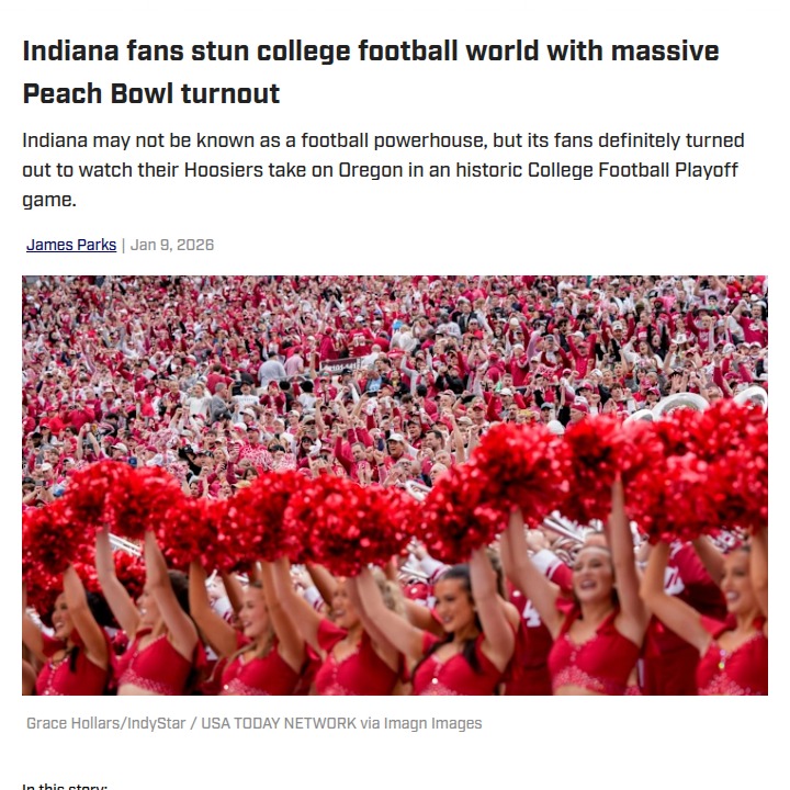 Amy Williams+FollowHoosier pride takes over Atlanta at Peach BowlIndiana fans just turned Atlanta into a sea of crimson, showing up in massive numbers for the Peach Bowl and making it feel more like a home game than a neutral site. The Hoosiers are on the verge of a truly historic season—just two wins away from a perfect 16-0 record, something not seen since 1894! Coach Curt Cignetti has transformed Indiana from perennial underdogs into a powerhouse, and the energy from the crowd proves just how much this run means to the community. Can Indiana finish the job and claim their first national title? #Sports #Football #IndianaHoosiers00Share