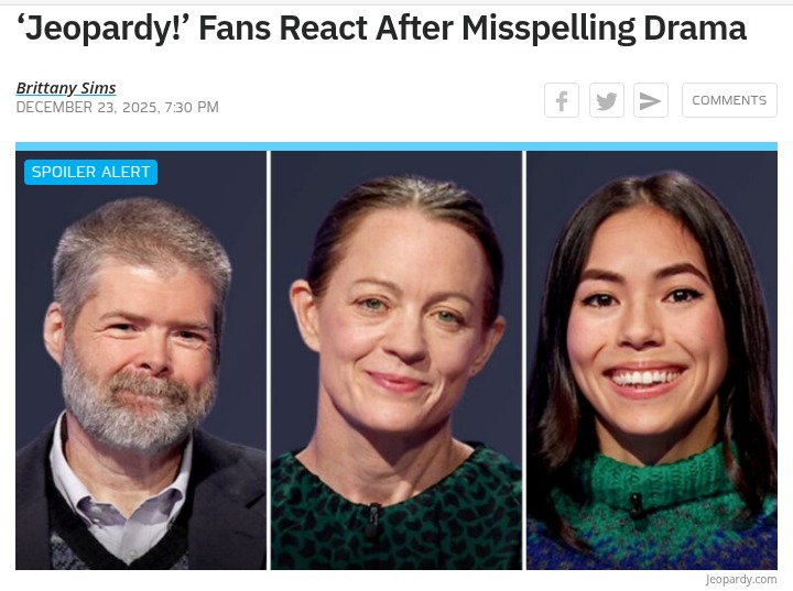 Ryan Massey+FollowJeopardy! Misspelling Drama Sparks Debate 🤔Did anyone else catch the spelling controversy on Jeopardy! last night? Michelle Tsai’s Final Jeopardy answer was technically misspelled, but Ken Jennings still accepted it, letting her win by just $1! Fans are split—some say it’s fair since it sounded right, others think rules are rules. Is Jeopardy! getting too lenient or was this the right call? #Entertainment #TVSeries #Jeopardy10Share